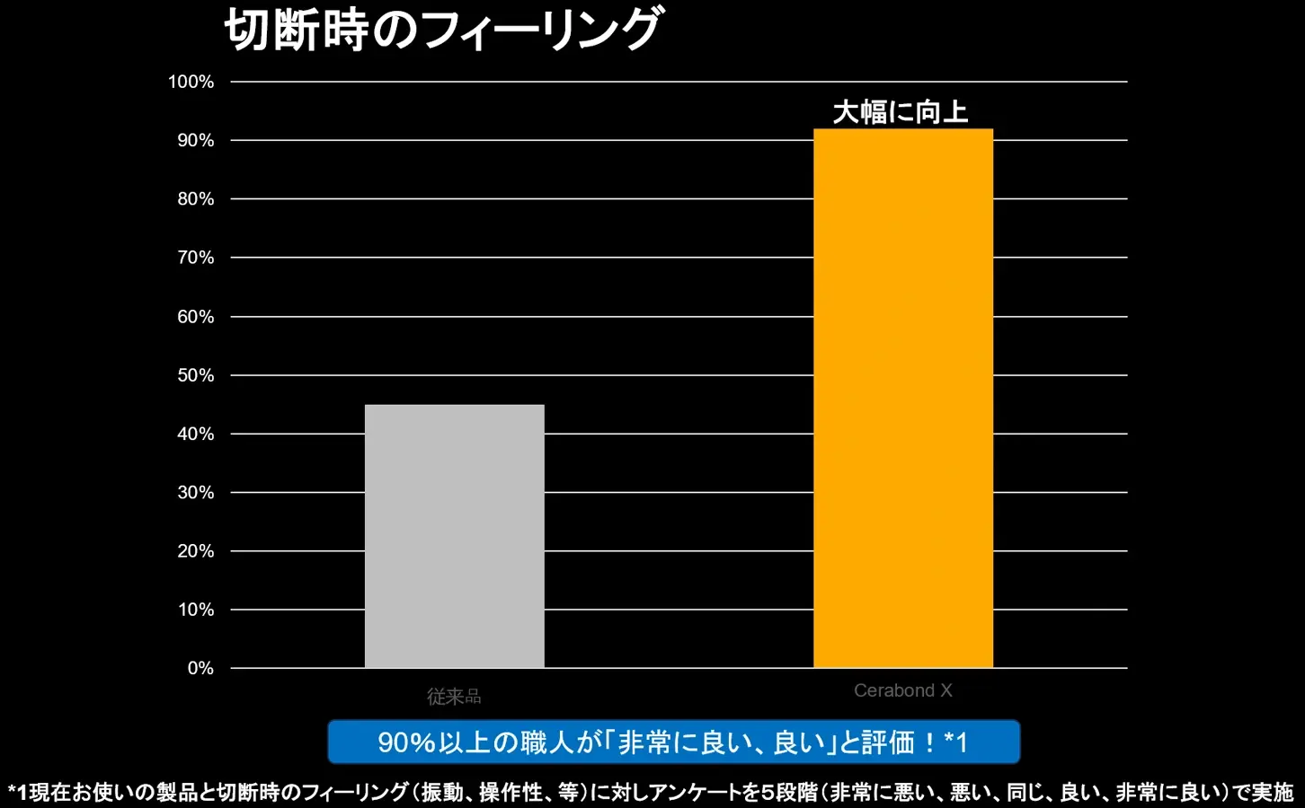 それに対し、セラボンド Xは、最初から最後まで優れた性能を発揮します。これは特殊セラミック砥粒が破砕によって常に新しいエッジを形成し、この砥粒の性能を最適に生かすボンドの技術革新によるもので、切れ味に優れ、性能が非常に安定しています。